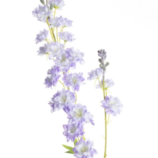 Ostróżka dekoracyjna o fioletowo-białej kolorystyce świetnie przypomina żywą roślinę. Odcienie fioletu, bieli i zieleni nadają jej naturalnego wyglądu, który doskonale komponuje się zarówno z nowoczesnymi, jak i tradycyjnymi wnętrzami. Gałązkę ostróżki możesz łatwo dopasować do Twojego wnętrza, używając jej jako samodzielna dekoracja do wazonu lu w komplecie z innymi roślinami.