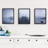 Klimatyczny obraz w ramie przedstawiający mgliste jezioro z pływającymi kaczkami. Utrzymany w szaroniebieskiej kolorystyce i oprawiony w cienką, czarną ramę. Gładka i spokojna tafla jeziora sprawia, że obraz jest niezwykle kojący i tajemniczy. Wspaniale zaprezentuje się powieszony w salonie, sypialni lub gabinecie. Z jego pomocą możesz stworzyć również rozmaite kompozycje. Do kompletu polecamy pozostałe dwa obrazy z tej samej kolekcji, z którymi stworzy spójną, efektowną całość. Wymiary: szer. 30cm, gł. 1,5cm, wys. 40cm. Materiał: tworzywo sztuczne/ płyta mdf/ szkło.