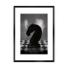 Czarno- biały plakat ze stylowym motywem szachowej figury – skoczka, potocznie określanego jako konik.