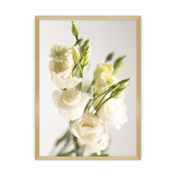 Piękny plakat z motywem kwiatowym- białymi eustomami. Plakat ten rozświetli wnętrze jasnymi tonami. Będzie elegancką dekoracją salonu lub sypialni, wniesie do wnętrza świeżość.