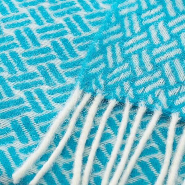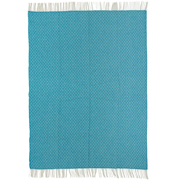 Elegancki, wełniany pled z wzorem plecionki w turkusowym kolorze.Z dwóch stron zakończony frędzlami w kolorze kremowym. Rewers koca przedstawia ten sam wzór lecz w jaśniejszych, zmienionych tonacjach.