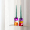 Świecznik ze szkła w radosnych kolorach to wspaniała propozycja do dekoracji salonu lub sypialni. Świecznik jest dwustronny, dzięki czemu możesz umieścić w nim zarówno pojedynczą wąską świecę jak i tealight. Wesołe kolory i trójwymiarowy wzór pięknie odbijają światło, nadając wnętrzu przytulny klimat.