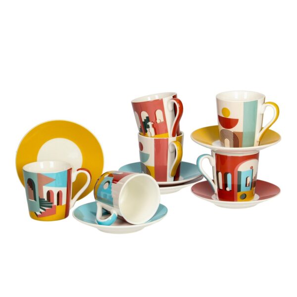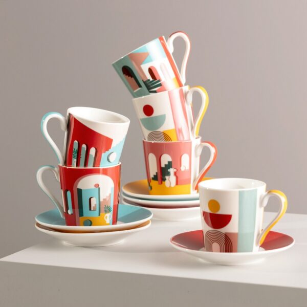 Komplet filiżanek do espresso ze spodkiem wykonanych z porcelany. Ożywcza kolorystyka i oryginalne wzornictwo sprawia, że serwowanie aromatycznej kawy to czysta przyjemność. Filiżanki do kawy Abstractio to wspaniały pomysł na prezent na różne okazje, idealny dla kawoszy!
