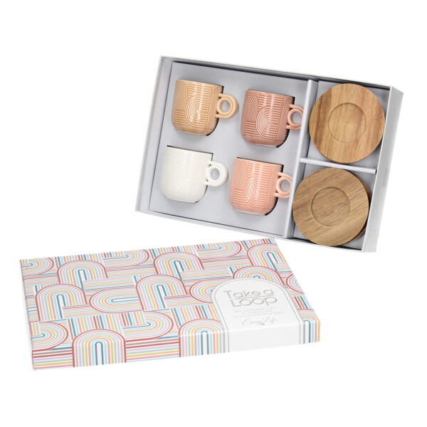 Komplet Sottile zawiera 4 porcelanowe filiżanki w ozdobnym pudełku. To wspaniały zestaw filiżanek na prezent na różne okazje.Produkt można czyścić w zmywarce i używać w kuchence mikrofalowej.Wymiary: szer. 8,5 cm, dł. 5,5 cm, wys. 6,5 cm; spodek: szer. 9 cm, dł. 9 cm, wys. 1 cm.Pojemność: 110 ml.Materiał: porcelana / drewno akacjowe.Kolor: różowy/biały/beżowy/naturalny.
